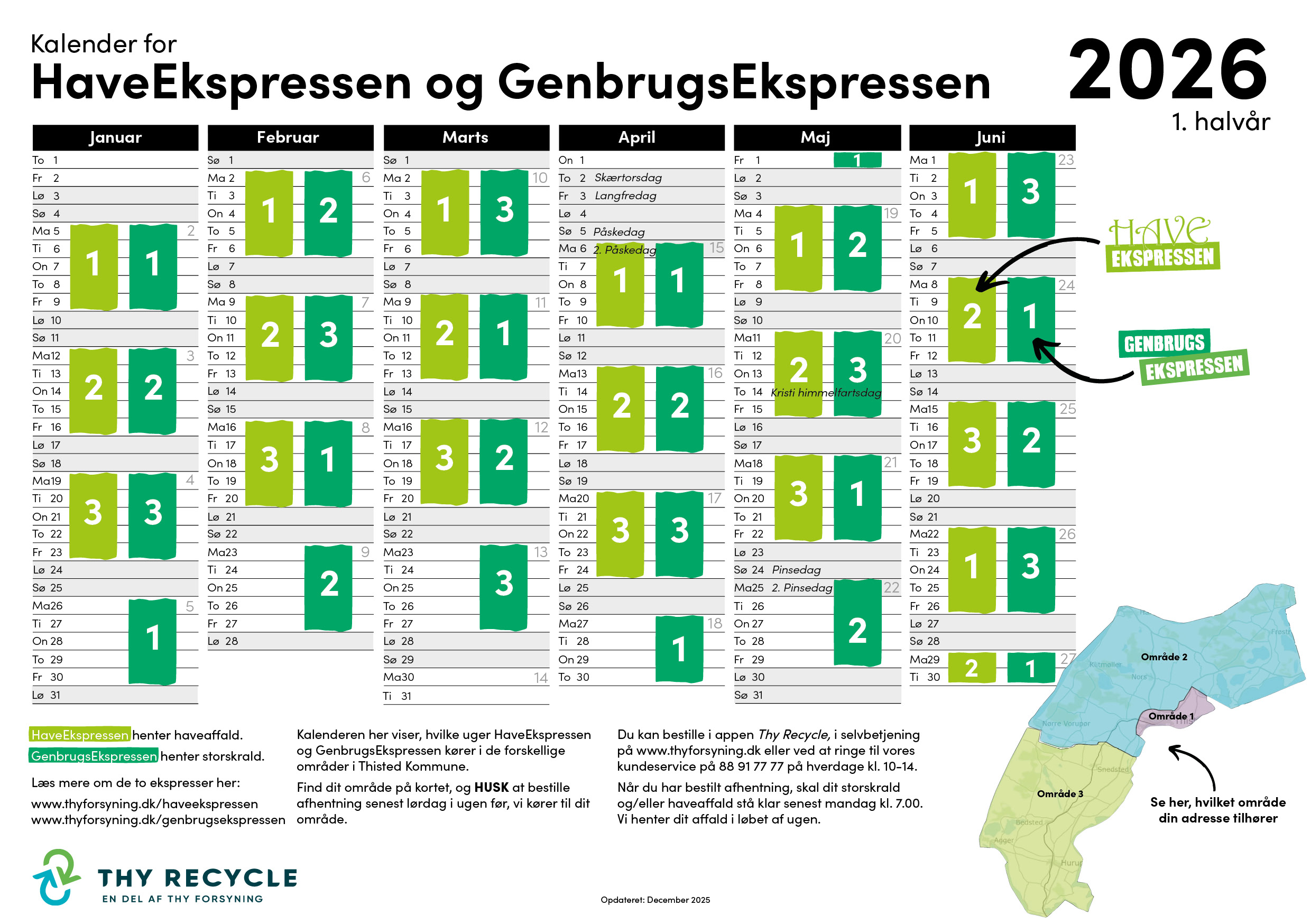 Når du har bestilt HaveEkspressen, får du angivet en uge, hvor vi henter haveaffald i det område, som din adresse tilhører. Se, hvilket område din adresse tilhører, på kortet. Du kan også finde dit område i brevet fra Thy Forsyning, udsendt i juli 2025.